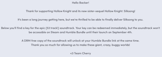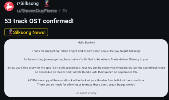 据推特博主@Daily Silksong News透露,Team Cherry官方邮件确认《丝之歌》原声带将包含多达53首曲目,数量达到前作本体OST的两倍,内容量大幅提升!