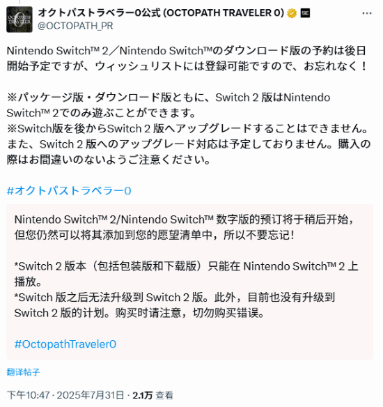 任天堂近日宣布《八方旅人0》将于12月4日发售,并在第三方直面会上展示了游戏内容。知名记者Genki分享了NS2和PS5实体版封面图,但官方提醒封面可能调整,最终以正式版为准。