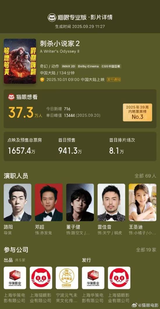 电影《刺杀小说家2》发布点映通知,将于9月29日在指定影城开启点映。据猫眼专业版数据显示,截至当前影片预售总票房已突破1657.4万元,市场期待值持续攀升。