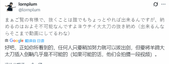日本剑术家随即回应,@Harima_mekkai成功复现拔刀动作,使用1.5公斤大太刀完成操作,证实其可行性。但专家指出游戏中的反向收刀在现实中难以安全实现。