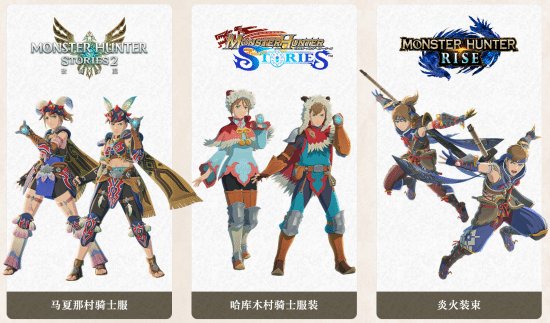 只需在设备中保留《怪物猎人物语1》《怪物猎人物语2》或《怪物猎人:崛起》的存档,即可分别获得马夏那村骑士服、哈库木村骑士服装及炎火装束三款特典外观。