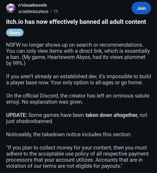 独立游戏平台itch.io近期被曝对成人内容进行"影子封禁",包括《黑莓蜜糖》制作人在内的多位开发者反映,带有"NSFW"标签的游戏被悄然移出搜索结果,部分作品甚至未经警告就被下架。