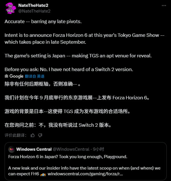 据NateTheHate2透露,如无变动,《极限竞速:地平线6》计划于今年9月东京电玩展正式公布。日本背景的设定与东京电玩展高度契合,成为宣传的理想舞台。目前尚未有Switch版本的相关消息。