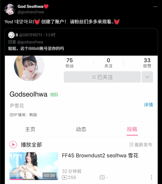 《剑星》伊芙体模尹雪花正式入驻B站,账号名为Godseolhwa。尽管尚未认证且粉丝数不多,但尹雪花本人已在推特确认账号真实性,并发布了首条视频分享FF45拍摄现场花絮。