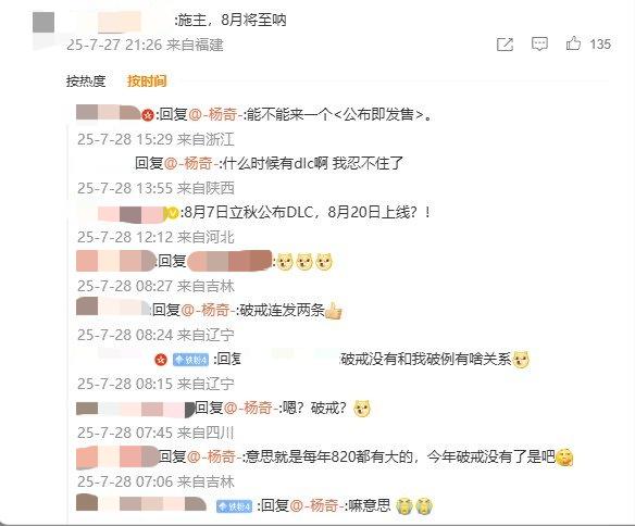杨奇在评论区回复玩家“秋天最适合破戒了”,这一神秘发言迅速引发热议。玩家结合此前游戏科学公司“25820”彩蛋(暗示8月20日)及杨奇发布的“断臂残圆”猪八戒玩偶照片,推测《黑神话:悟空》DLC或将在8月20日公布新内容。
