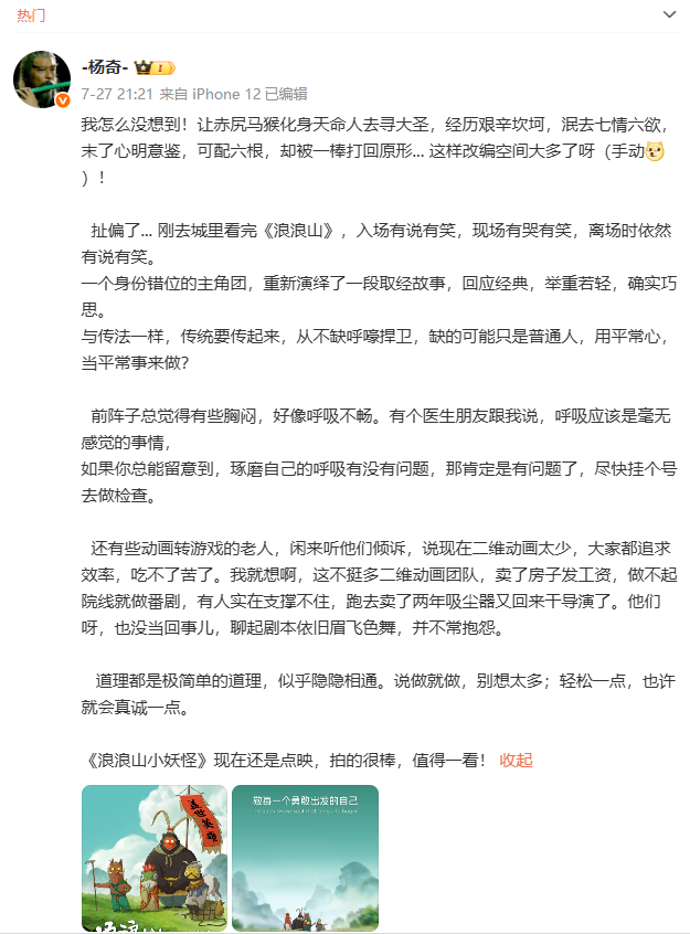 国产动画电影《浪浪山小妖怪》上映后口碑飙升,引发《黑神话:悟空》团队共鸣。主创杨奇以幽默方式探讨动画创作,强调“用平常心做平常事”的重要性,认为真诚源于轻松的态度。