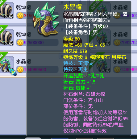 近日风少成功鉴定出梦寐以求的神器,令他欣喜若狂。这件来自畅玩服的60级帽子镶嵌6级月亮石,防御达105点,携带玉清诀特技可解除全队异常状态,配合再生特效实现每回合自动回血。符石组合石破天惊更强化了落雷符伤害输出。