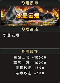 新服专属称号福利丰厚,预约即送基础称号【水墨云烟】,属性加成生命、真气及双攻。更高阶称号需通过累计充值解锁,提供暴击率、增伤等强力属性,助力玩家战力飙升。