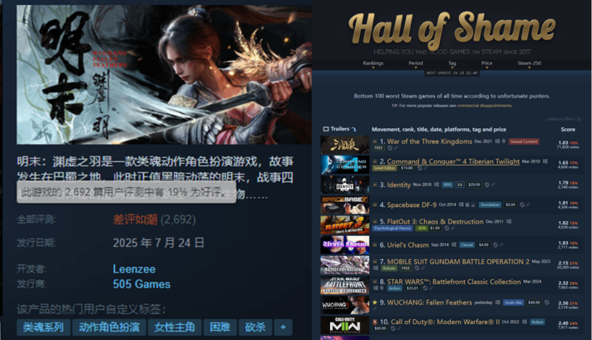 国产类魂游戏《明末:渊虚之羽》发售首日遭遇差评风暴,Steam好评率仅19%,迅速登上差评榜第9位。游戏因优化差、豪华版奖励发放混乱及外区价格“背刺”三大问题引发玩家强烈不满。